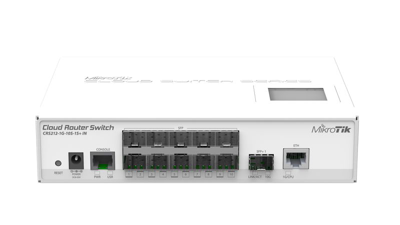 Cloud Router Switch 212-1G-10S-1S+IN is new “small size low cost” member of our CRS series. It comes with one Gigabit Ethernet RJ45 port, ten SFP cages and one 10G SFP+ cage, as well as LCD panel and serial port (RJ45). Product includes indoor desktop case and power supply. Special ears are provided for mounting the unit in rack.
