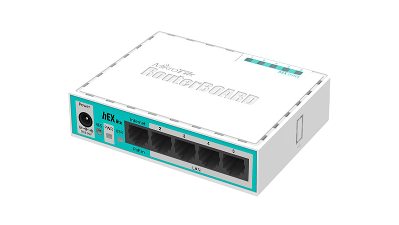 The RB750r2 (hEX lite) is a small five port ethernet router in a nice plastic case.