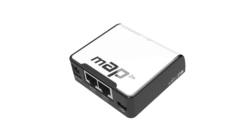 The mAP (micro Access Point) is a tiny size wireless 2.4GHz Access Point with full RouterOS capabilities. It is very portable, since it accepts power from a wide variety of sources - USB, Passive PoE and power jack. It also works as a PoE injector - the second Ethernet port provides up to 500mA of power to another device, for example, you can connect a SXT CPE device to it.