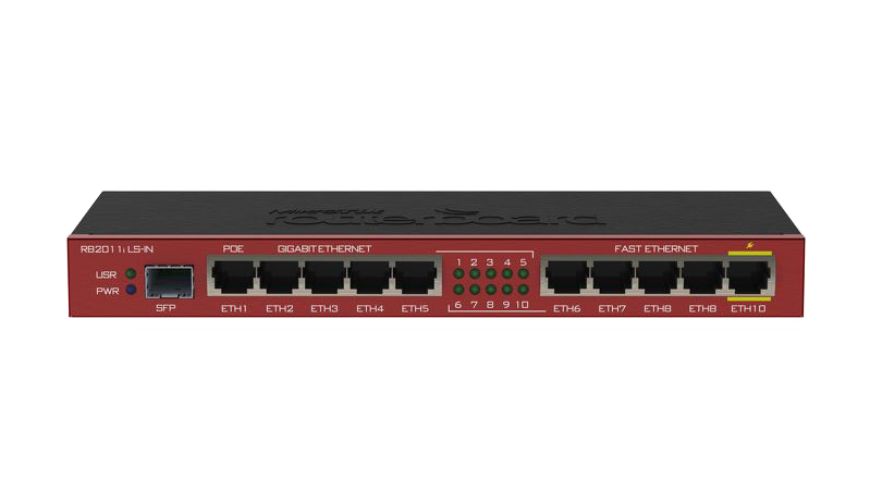 The RB2011iLS has 11 ports: Gigabit SFP cage and five Gigabit Ethernet ports that can be switched together providing affordable wirespeed Fiber-to-Copper converter, and additional five Fast Ethernet ports. Board can be powered by power jack or PoE.